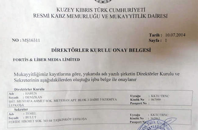 Resmi Kabz Memurluğu ve Mukayyitlik Dairesi'nden edindiğimiz, Fortis&Liber Media Limited'in Direktörler Kurulu Onay Belgesi'nde, Temel Bulut'un adres "Feride Hikmet Sok. No:44 Taşkınköy, Lefkoşa" olarak gösterdiği ikamet adresinin yalan beyan olduğu ortaya çıkarken, bu adreste Taksim Üstüner adlı vatandaşın yaşadığı öğrenildi.