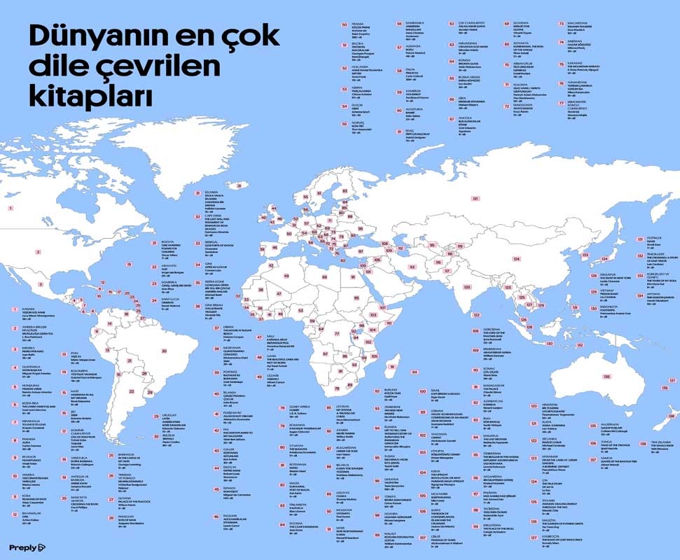 Ana dilinde konuşan 32 bini aşkın öğretmeni on binlerce öğrenciyle online platformda ve mobil uygulamalarda bir araya getiren Preply’nin hazırladığı dünyada en çok okunan ve çevirisi yapılan kitaplar araştırması, Türkiye verileriyle de zenginleştirildi. Dünya çapında her ülkenin en çok dile kazandırılan kitabının sıralandığı listede yer alan 140’a yakın kitaptan en az 64’ünün Türkçeye de kazandırıldığı görüldü. Dünya çapında popüler her iki kitaptan birinin Türkçe dilinde de okunabildiğini gösteren araştırma, Türkçeden en çok dile çevrilen eserin ise Nobel Edebiyat ödüllü yazar Orhan Pamuk’un Benim Adım Kırmızı adlı kitabı olduğunu gösterdi.
