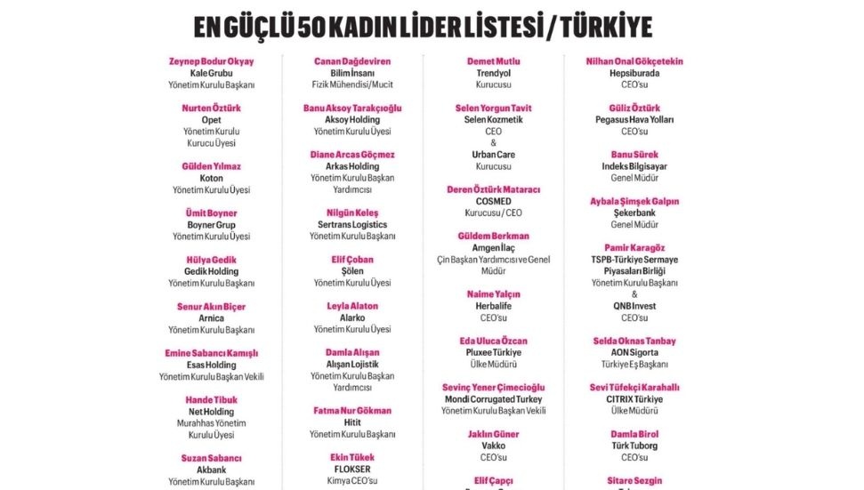 Avrupa’da ve global arenada başarıya imza atan ve Türkiye’yi başarılarıyla temsil eden kadın liderlerin yer aldığı liste, aynı zamanda iş dünyasının liderlik, yönetim ve sürdürülebilir iş stratejilerine yön veren şirketlerini, kadın istihdam politikasıyla farklılaşan marka ve kuruluşlarını da gündeme getiriyor. İş dünyasındaki kadınlar, çok yol kat ettiler.