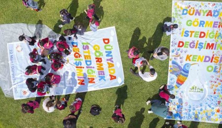 Öğrenciler, Amcaoğlu ile birlikte “Dünyada Görmek İstediğin Değişimin Kendisi Ol!” yazılı pankartı boyarken hem eğlendi hem de Su Günü sebebiyle bilinçlendiler.