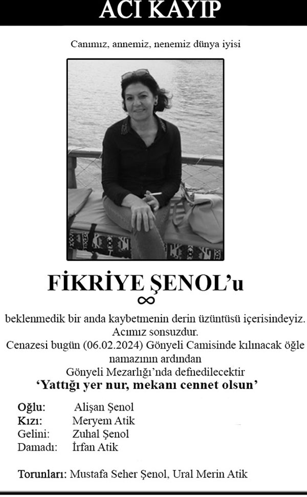 Gönyeli sakini Fikriye Şenol hayatını kaybetti. Şenol bugün Gönyeli Cami'nde kılınacak cenaze namazı ardından Gönyeli Mezarlığı'na defnedilecek.